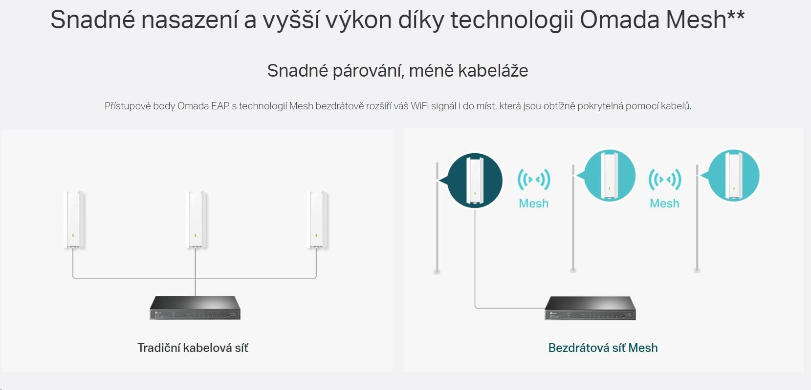 | Wireless Functions | • 1024-QAM • 4× Longer OFDM Symbol • OFDMA • Multiple SSIDs (Up to 16 SSIDs, 8 for each band) • Enable/Disable Wireless Radio • Automatic Channel Assignment • Transmit Power Control (Adjust Transmit Power on dBm) • QoS (WMM) • MU-MIMO • Omada Mesh** • Seamless Roaming** • Band Steering • Load Balance • Airtime Fairness • Beamforming • Rate Limit • Reboot Schedule • Wireless Schedule • Wireless Statistics based on SSID/AP/Client |