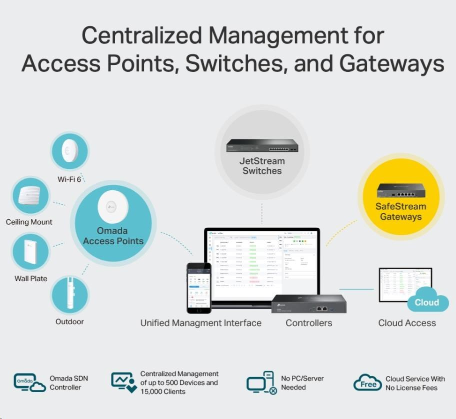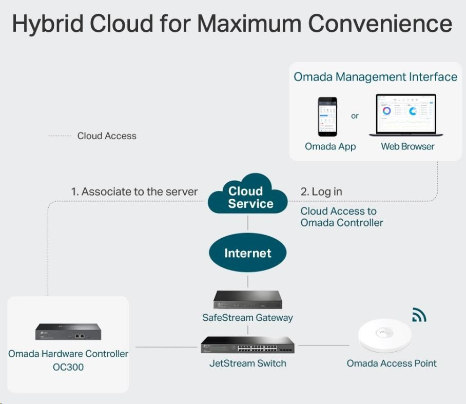 | Centralized Management | • Up to 500 Omada access points, JetStream switches, and SafeStream routers* • Up to 15,000 clients *Only some JetStream switches and Safestream gateways can be centrally managed by OC300, please refer to www.tp-link.com/business-networking/all-omada/ to find all the models supported by OC300 |