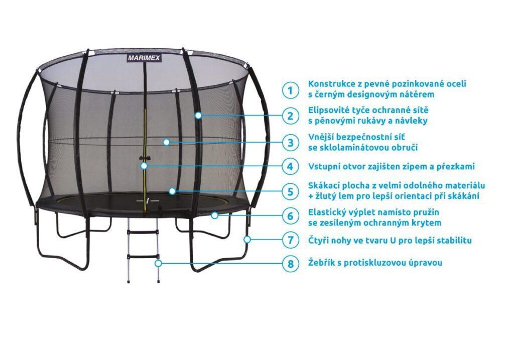 Bezpružinová trampolína Marimex Comfort je výjimečná díky nové technologii upevnění skákací plochy do rámu. Elastický výplet namísto pružin je bezpečnější, zvyšuje flexibilitu odrazové plochy a způsobuje měkčí dopad. Orientaci při skákání napomáhá žlutý lem na odrazové ploše. Bezpečnostní síť na vnější straně trampolíny je pružná a zároveň výborně drží tvar. Instalace kovové konstrukce i sítě je velmi snadná, čítá pouze 16 šroubů. Dokonalou stabilitu zajišťují 4 nohy ve tvaru písmene U. Výhody trampolín Marimex Comfort Elastický výplet namísto pružin - bezpečný systém a měkčí dopad Snadná instalace - pouze 16 šroubů Žlutý lem - napomáhá orientaci při skákání Odrazová plocha Materiál odrazové plochy patří k nejkvalitnějším na trhu. Plocha je vyrobena ze speciálního polypropylenu s ochranou proti UV záření, který zaručuje dlouhou životnost. Speciální neabrazivní (hladká) povrchová úprava zabrání odření kůže při dopadu. Vnější ochranná síť Ochrannou síť najdete přímo v balení, nemusíte si ji dokupovat zvlášť. Ochranná síť na vnější straně trampolíny je pružná a zároveň výborně drží tvar. Tyče jsou obaleny ochranným návlekem z měkčené pěny. Nohy trampolíny jsou samostatné a zvyšují stabilitu celé trampolíny. Zvenku i zevnitř jsou galvanizované trubky rámu. Parametry ochranné sítě materiál - polyester, černá průměr ochranné sítě - 366 cm výška ochranné sítě - 180 cm průměr tyče ochranné sítě - 25,4 mm tloušťka tyče ochranné sítě - 1,2 mm tloušťka trubky rámu: 38 x 1,5 mm tloušťka krytu rámu: 13 mm návlek tyče ochranné sítě - měkčená pěna vrchní obruč ochranné sítě - sklolaminátová tyč Materiál a složení ochranných prvků Trubky a stojny: pozinkovaná ocel Skákací plocha: PP (polypropylen) Ochranná síť: PE (polyethylen) Ochranný lem skákací plochy: EPE (expandable polyethylene) + vnitřní výstelka: PE (polyethylen) Bezpečnost Trampolíny jsou určené pro náročné pohybové aktivity, proto klademe důraz na jejich bezpečnost a spolehlivost. Použití kvalitních materiálů a moderních technologií při výrobě řadí naše trampolíny mezi nejbezpečnější a nejspolehlivější na českém trhu. K tomuto produktu doporučujeme dokoupit položku 19000730 - Sada kotvící s kovovou sponou (3 ks vrtáků)-trampolína. Rozměry trampolíny Průměr trampolíny: 366 cm Průměr skákací plochy: 312 cm Výška skákací plochy: 82 cm Výška včetně ochranné sítě: 265 cm Max. zatížení: 150 kg Počet nohou: 4 Parametry ochranné sítě Materiál: Polyester, černá Průměr ochranné sítě: 366 cm Výška ochranné sítě: 180 cm Průměr tyče ochranné sítě: 25,4 mm Tloušťka tyče ochranné sítě: 1,2 mm Návlek tyče ochranné sítě: Měkčená pěna Vrchní obruč ochranné sítě: Sklolaminátová tyč Parametry trampolíny Počet tyčí: 8 Ochranná síť vrchní: Ano Ochranná síť spodní: Ne Žebřík: Ano Logistické údaje Počet kartonů: 2 Rozměry a váha balíku: 148 x 44 x 33 cm, 47,10 kg 116 x 40 x 22 cm; 22,80 kg Odhadovaná doba montáže: 90 minut.