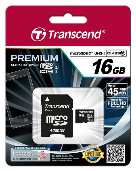 Popis TRANSCEND MicroSDHC karta 16GB Premium, Class 10 UHS-I 300x + adaptér