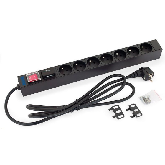 Akční nabídky na váš e-mail19“ rozvodný panel 1U; 7 x zásuvka podle ČSN, max. 16 A; kabel 3 x 1,5 mm, 2 m + zástrčka univerzál CZ-DE max. 16 A; bleskojistka; podsvícený vypínač s bezpečnostním krytem; RAL 9005