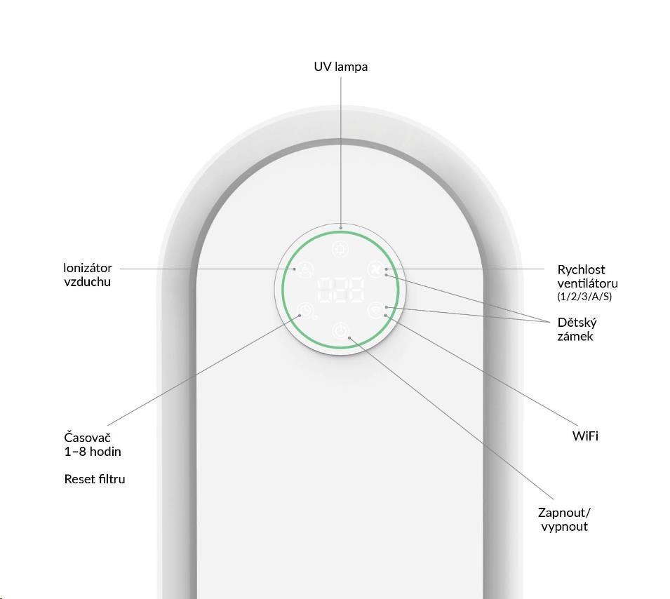 Ovládání čističky vzduchu je velmi jednoduché a intuitivní. Všechny funkce lze nastavit pomocí ikon na dotykovém displeji.