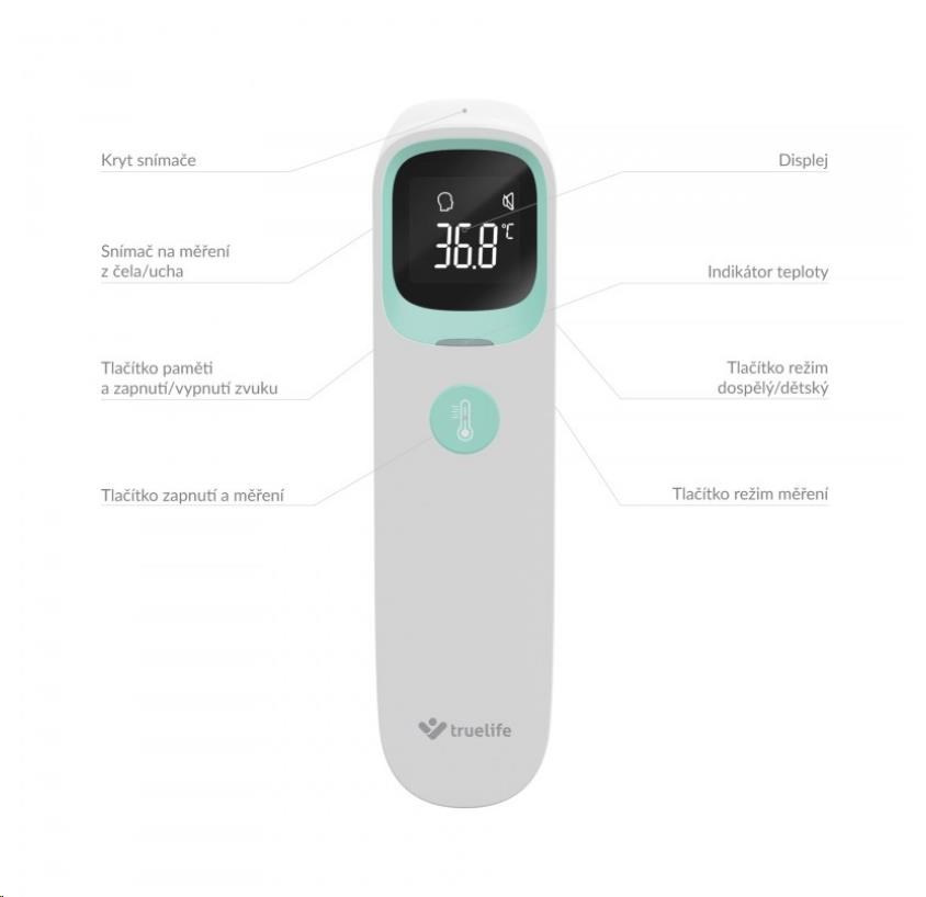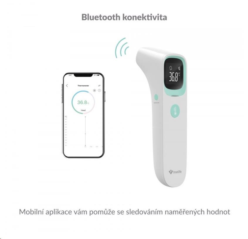 Zdlouhavému držení teploměru v podpaží odzvonilo. Usnadněte si měření teploty při chřipce nebo nachlazení s bezkontaktním teploměrem TrueLife Care Q10 BT. Teplotu dokáže změřit během sekundy s přesností na 0,1°C. TrueLife Care Q10 BT nabízí tři režimy měření, díky kterým dokážete bezkontaktně změřit přesnou teplotu osob z ucha nebo čela, i předmětů nebo tekutin Naměřené hodnoty se zobrazují na LCD displeji a jsou doprovázeny barevným indikátorem a zvukovým signálem. Díky zabudovanému Bluetooth lze teploměr spárovat s telefonem a hodnoty měření uchovávat v mobilní aplikaci. Teploměr se díky jeho malým rozměrům perfektně hodí na cesty, dokáže si zapamatovat 20 naměřených hodnot, a jeho baterie vystačí až na 20 000 měření.