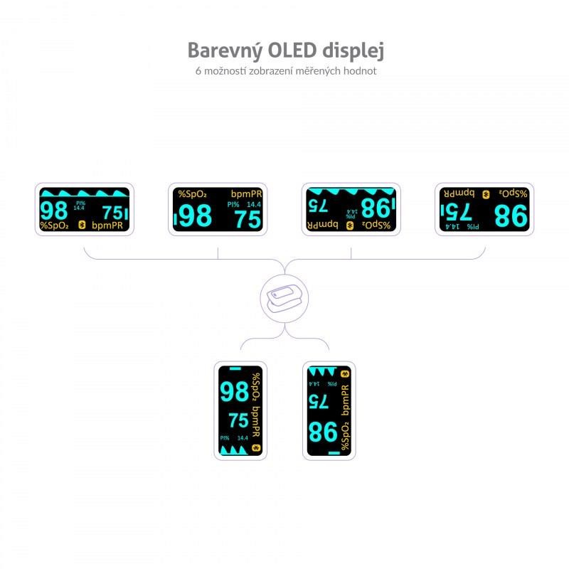 Oxymetr disponuje přehledným OLED displejem, jehož nastavení lze přizpůsobit dle vašich preferencí. Na výběr je 6 možností zobrazení měřených hodnot. Nastavit můžete i preferovanou intenzitu jasu, zvukový indikátor, či zvukový doprovod tepu. Díky zabudovanému Bluetooth lze oxymetr spárovat s chytrým telefonem. Naměřené hodnoty máte uchované v aplikaci, která je v češtině, a jejich historii tak máte neustále u sebe a můžete ji sdílet s lékaři nebo rodinnou. Vývoj měření vidíte v aplikaci na přehledném grafu.