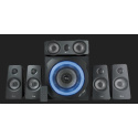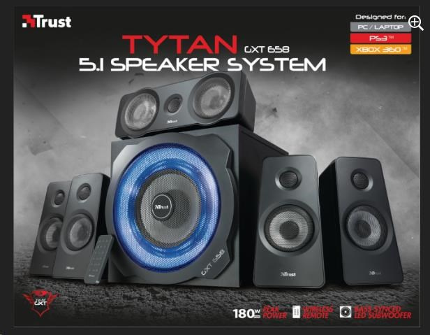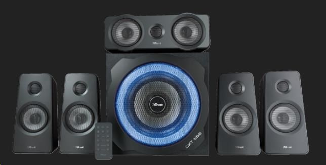 | Package contents | Subwoofer | 4x satellite speakers with cables attached | 1x center speaker with cable attached | Wireless remote control incl. battery | Converter cable to connect game console | Power cable | User guide | Gaming sticker |