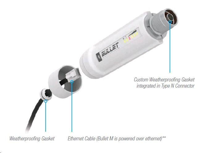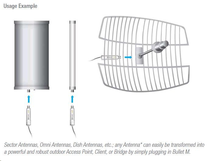 Bullet M2 HP je miniaturním a nejrychlejším 2,4GHz outdoorovým klientem, který lze jednoduše připevnit přímo k anténě. Tím odpadá potřeba použití ztrátového koaxiálního kabelu! Díky integrovanému ukazateli intenzity signálu lze přímo na místě správně nasměrovat klientskou anténu. Vysoká přenosová rychlost (až 100 Mbps) je dosažena díky podpoře standardu 802.11n a to za použití pouze jedné antény. Od starších verzí Bulletů se liší také vyšším výkonem procesoru, větší pamětí a vysokou citlivostí bezdrátové části.