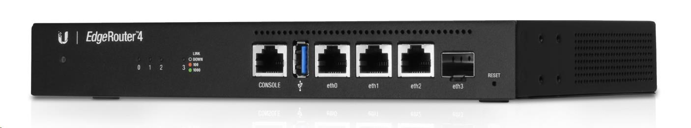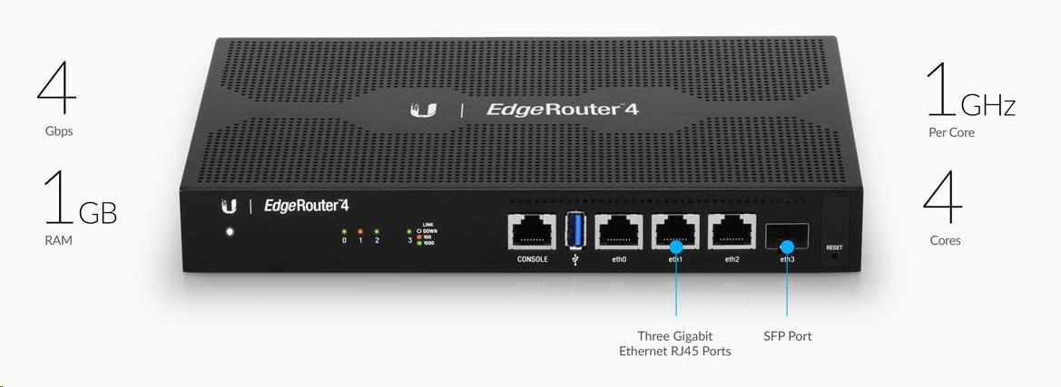 EdgeRouter 4 je vhodný všude tam, kde je nutné směrovat velké množství dat, do malých i středních firem a všude, kde je kladen důraz na bezpečnost sítě. EdgeRouter je vybaven celkem 3x Gbit ethernetovými porty, 1x SFP, dostatečně velkou operační pamětí 1GB typu DDR3, úložným prostorem o velikosti 4GB a 1x USB 3.0. Celý provoz pak řídí čtyřjádrový procesor taktovaný až na 1 GHz, MIPS64 s hardwarovou akcelerací pro zpracování paketů. EdgeRouter nabízí všechny základní funkce, které u routeru očekáváte.
