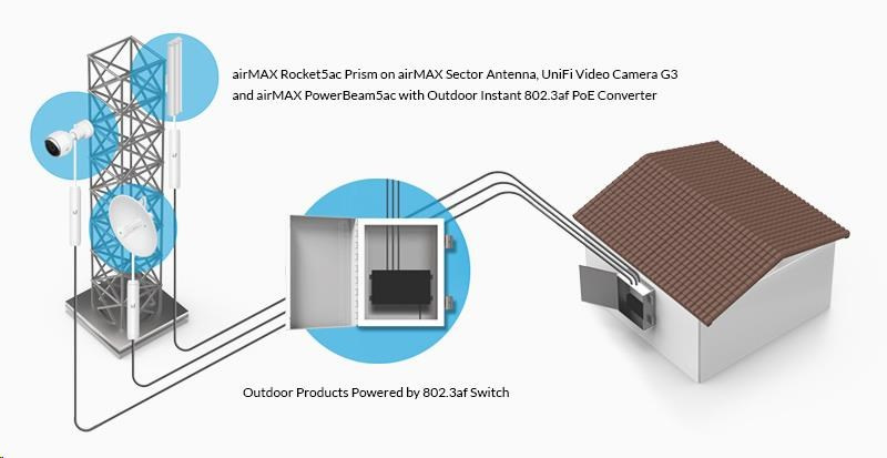 Pomocí tohoto gigabitového konvertoru je možné napájet jednotky UBNT switchem s aktivním PoE dle 802.3af (48V). Konvertor komunikuje se switchem dle 802.3af a do výstupu propouští již klasické pasivní PoE, v tomto případě 24V/0,5A. Lze použít se všemi jednotky od Ubiquity (je kompatibilní i s routerboardy od Mikrotiku).