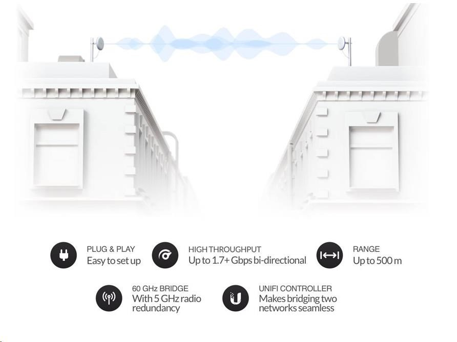 UniFi Building Bridge je 60GHz point-to-point pojítko s 5GHz zálohou pro rozšíření sítě například o sousední budovu. Propustnost pojítka je 1.7Gbps+ s maximálním dosahem 500m a správou nebo monitoringem přes UniFi Controller.