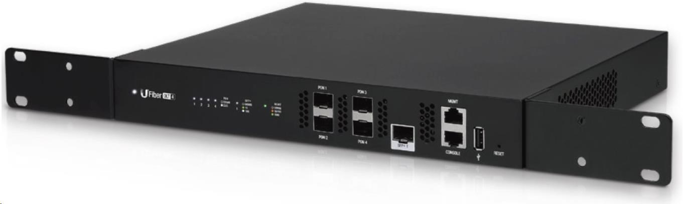 Co se konektorů týče, UF-OLT-4 má kromě 4 GPON portů také 1 SFP+ port s rychlostí 1/10G, jeden ethernetový port určený pouze pro management a jeden konzolový port.