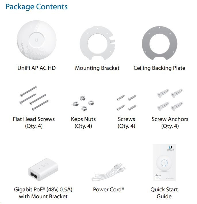 UniFi AP AC HD je první 802.11ac wave2 AP od Ubiquiti s celkovou propustností až 2533Mbps (2.4GHz 800Mbps + 5GHz 1733Mbps), Disponuje 4x4 MU-MIMO všesměrovými dvou-polarizačními dualband. 3dBi antény pro 2.4GHz a 4dBi pro 5GHz s výkonem rádiové části až 25dBm jak pro 2.4 tak i pro 5GHz současně. Podporuje standardy 802.11a/b/g/n/ac/ac wave2, disponuje dvěma gigabit.ethernet. porty (druhý je v bridgi). Lze napájet prostřednictvím aktnivního PoE dle 802.3at případně pasivního (48V DC), PoE adaptér je součástí balení (pasivní). Maximální spotřeba činní 17W.