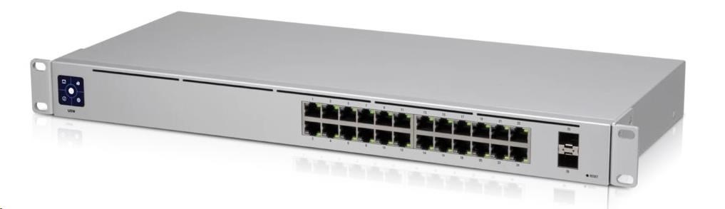 USW-24 je managovatelný Gigabitový L2 switch s montáží do 19" racku vybavený 24x Gigabit LAN porty a dvěma porty SFP s přenosovou rychlostí 1Gbps. Switch má kromě standardní výbavy také 1,3" dotykovým displej pro poskytování informací o systému, teplotě, statistice portů a mnoho dalšího. Switch díky své konstrukci a skvělému odvodu tepla nemá žádný ventilátor, tudíž nedělá žádný nadbytečný hluk, což je ideální například pro instalaci v kanceláři.