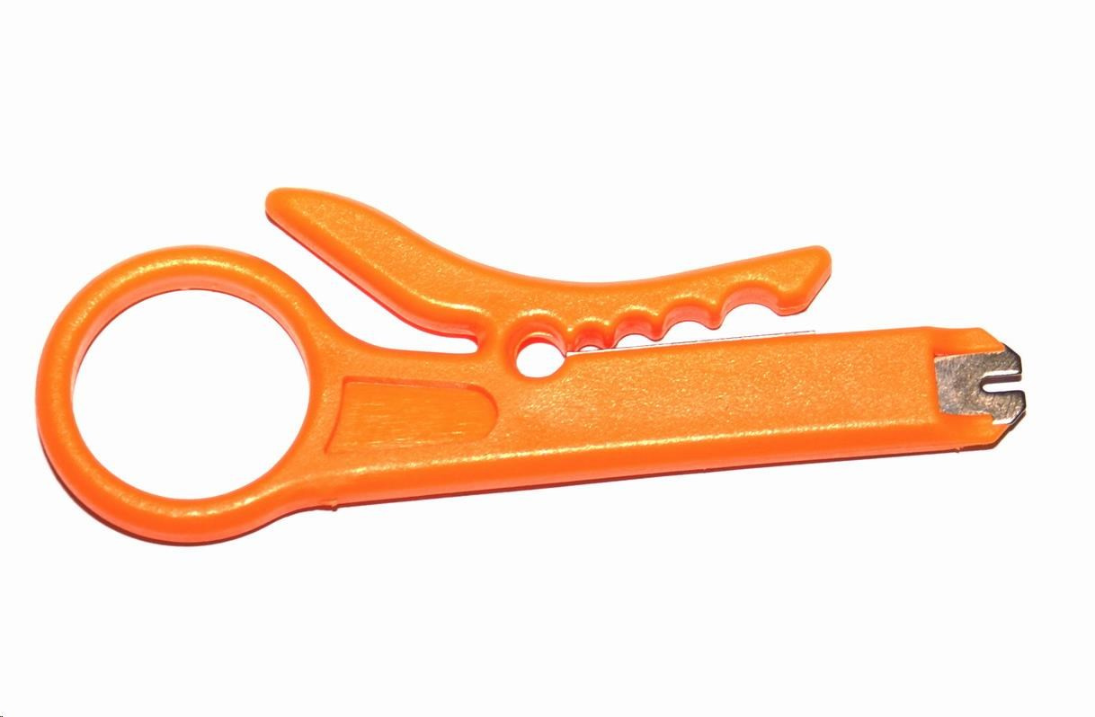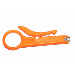 jednoduché ořezání vnější izolace UTP/FTP kabelu Na konci stripovače je zapuštěn nůž, který slouží k terminaci vodičů do svorkovnic blok 110.
