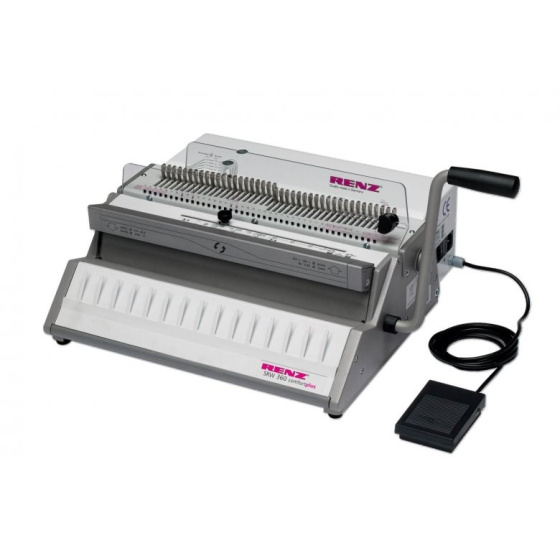 Pracovní šířka 360 mm, rozteč ok 3/1", děrovací kapacita 22 listů 80g papíru, rozměr děr 4×4 mm, max. rozměr hřbetu 16 mm, vyřaditelné nože, pohon děrování elektrický.