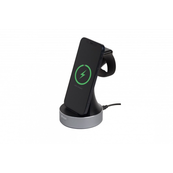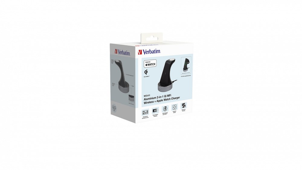 Nabíjejte pomocí nabíjecí stanice Verbatim 2 v 1 hodinky Apple Watch a iPhone (8 nebo novější) nebo jiné zařízení s bezdrátovým nabíjením s certifikací Qi.
