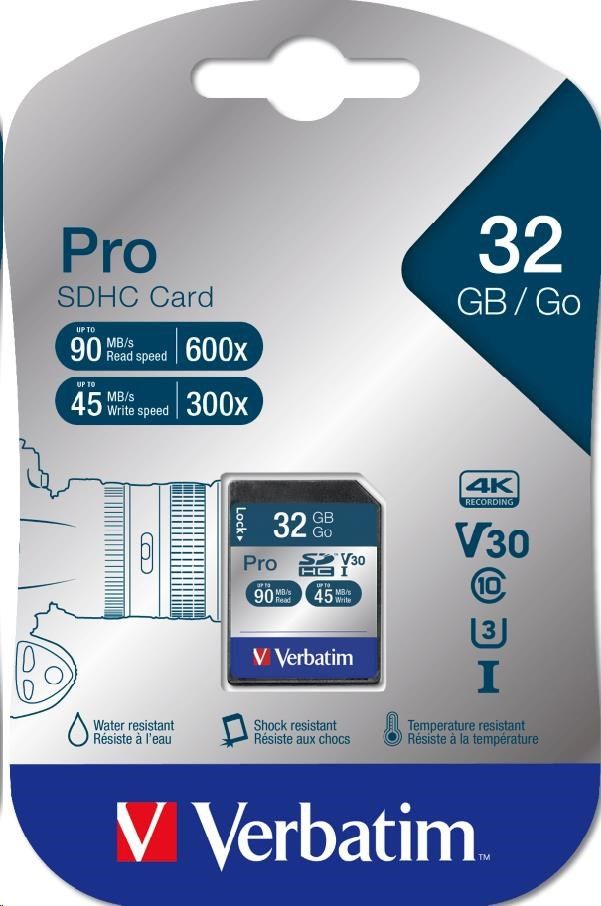 Verbatim Pro U3 Micro SDHC/SDXC Cards Verbatim Pro memory cards give Pro level performance to advanced cameras and HD camcorders. UHS Speed Class 3 (U3) rating means you can capture 4k ultra HD and Full HD video then transfer quickly to your computer for viewing and editing. Compatible with any device with an SDHC/SDXC* memory card slot. Read Speed: up to 90MB/Sec.** Write Speed: up to 45MB/Sec.** Suitable for 4k ultra HD video capture *SDXC compatible host device required **UHS-1 compatible device required, actual performance may vary depending on host device, interface & usage conditions Product Dimensions: 32mm x 24mm x 2.1mm Product weight: 1.8 grams Capacity: 32GB System requirements: Compatible with cameras and SDHC or SDXC supporting host devices.