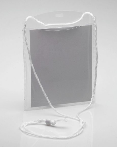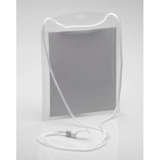 Visačka měkká průhledná z polyprophylenu včetně šňůrky na krk. Uvnitř s kartonem 97×110 mm. Velikost kapsy:114×137 mm, šňůrka bílá, tenká, kulatá, délka 90 cm..