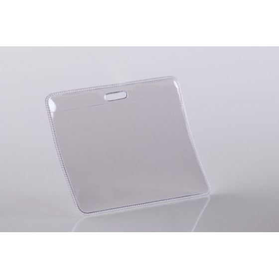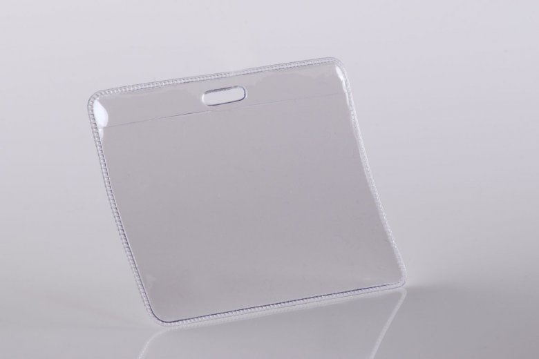 Čirá visačka z měkčeného PVC – vodorovná, vnitřní rozměr 90×58 mm. Možno zavěsit na klips, šňůrku nebo řetízek..