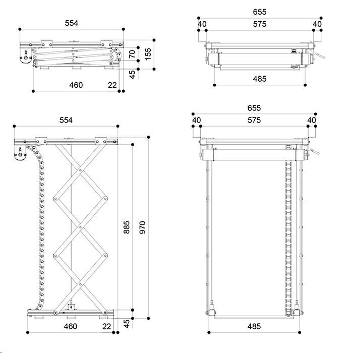 Rozměry uzavřeného výtahu 575 x 155 x 554 mm (š x v x h)
