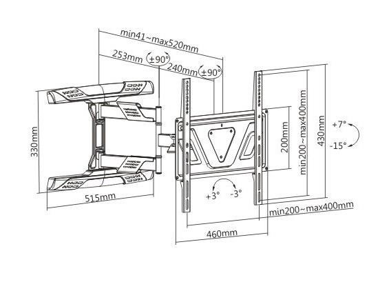 Nástěnný držák vynikající kvality a parametrů na Tv 32-65", otáčení +/-90°, naklápění +7° / -15°, vzdálenost od zdi 41-520mm, VESA 200x100 až 400x400, nosnost 35kg.Více