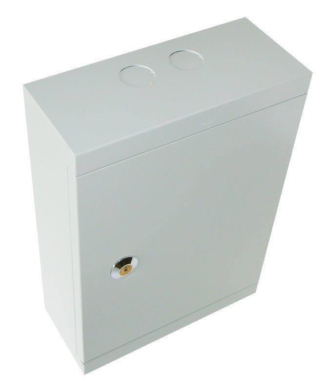 Kovový rozvaděč pro vnitřní instalace s DIN lištou. Rozvaděč je opatřen kovovým zámkem a ventilačními otvory.