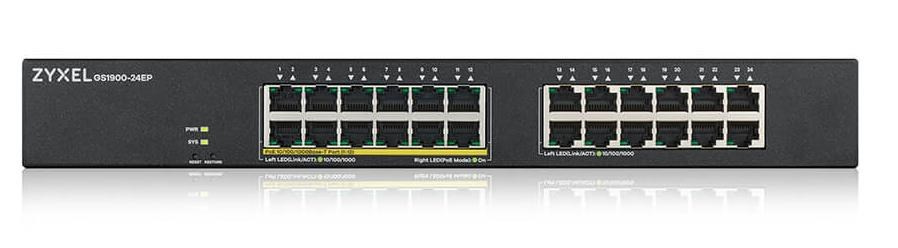 Popis Zyxel GS1900-24EP 24-port Gigabit Smart Managed PoE Switch, 24x gigabit RJ45 (z toho 12x PoE), PoE budget 130W
